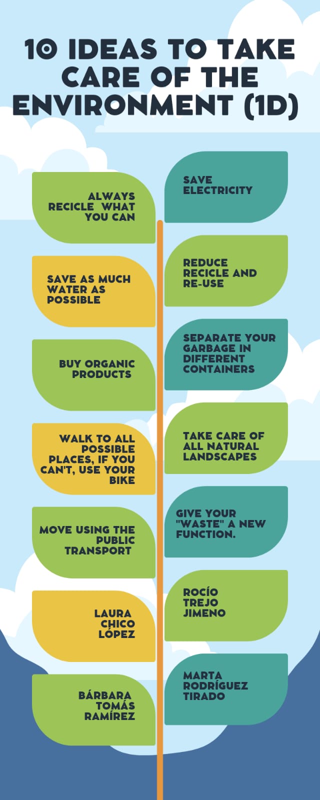 The bilingual groups of 1 year of ESO have worked the diverse problems related to the environment conservation and the different kinds of pollution that exist nowadays. They have created some posters and infographies with information about It and some tips and recommendations to save our Planet. Even they have created some sustainable sport games!!